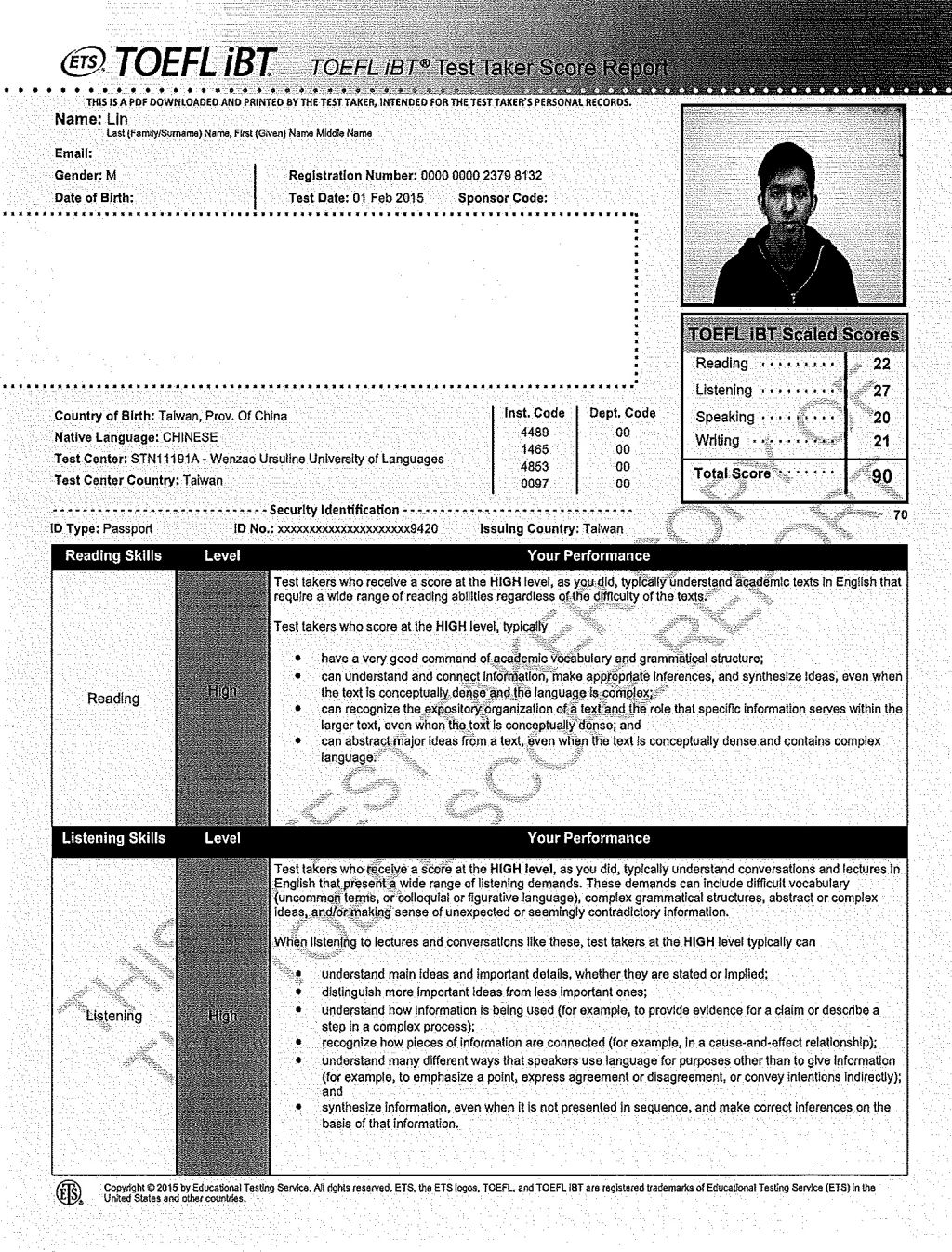 我是政大英文系二年級的學生,大一下開始自己準備托福,暑假期間在戴爾台中逢甲校上為期八週的密集課程。我在9月9日的考試中得到114分,分別是聽力30分,閱讀30分,寫作27分,口說27分。