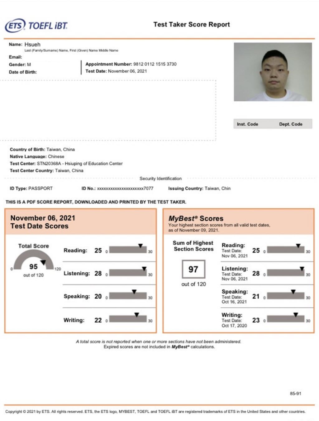 恭賀戴爾美語托福班薛△駿學員於近日取得托福95分好成績。
