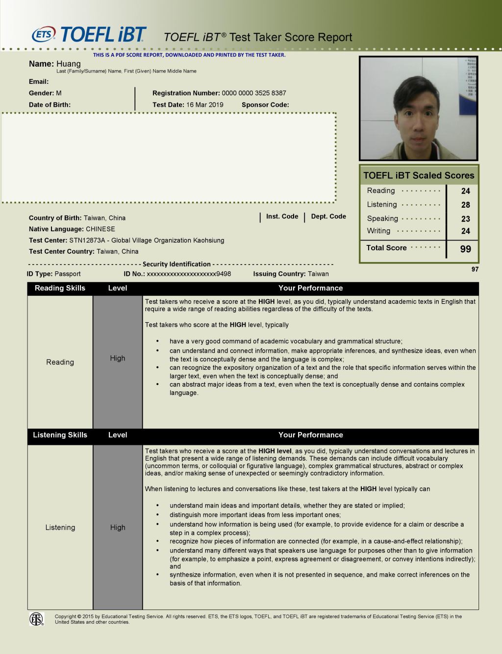 恭喜戴爾美語學員黃△寧取得iBT托福99分