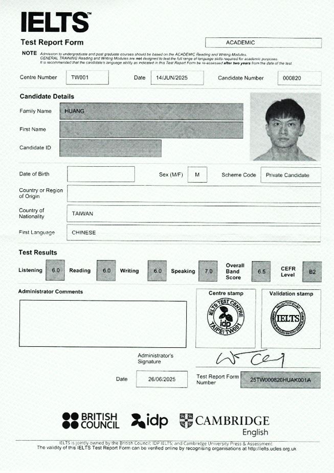 恭賀戴爾美語雅思班 黃△維 學員於近日取得 雅思6.5分 好成績。