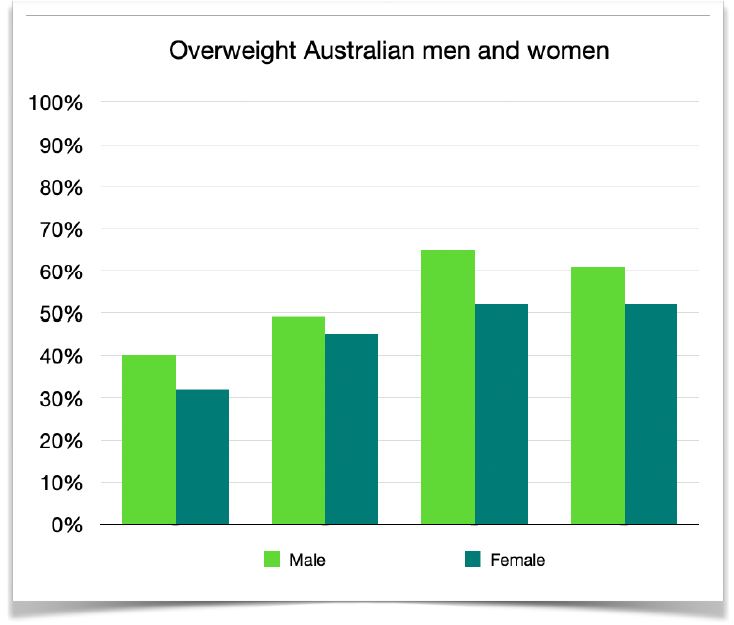 The bar chart compares the proportions of overweight Australian men and women across four age groups.