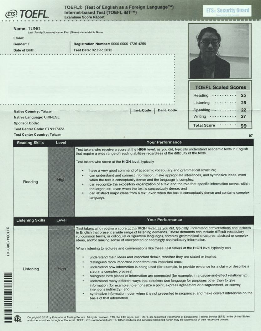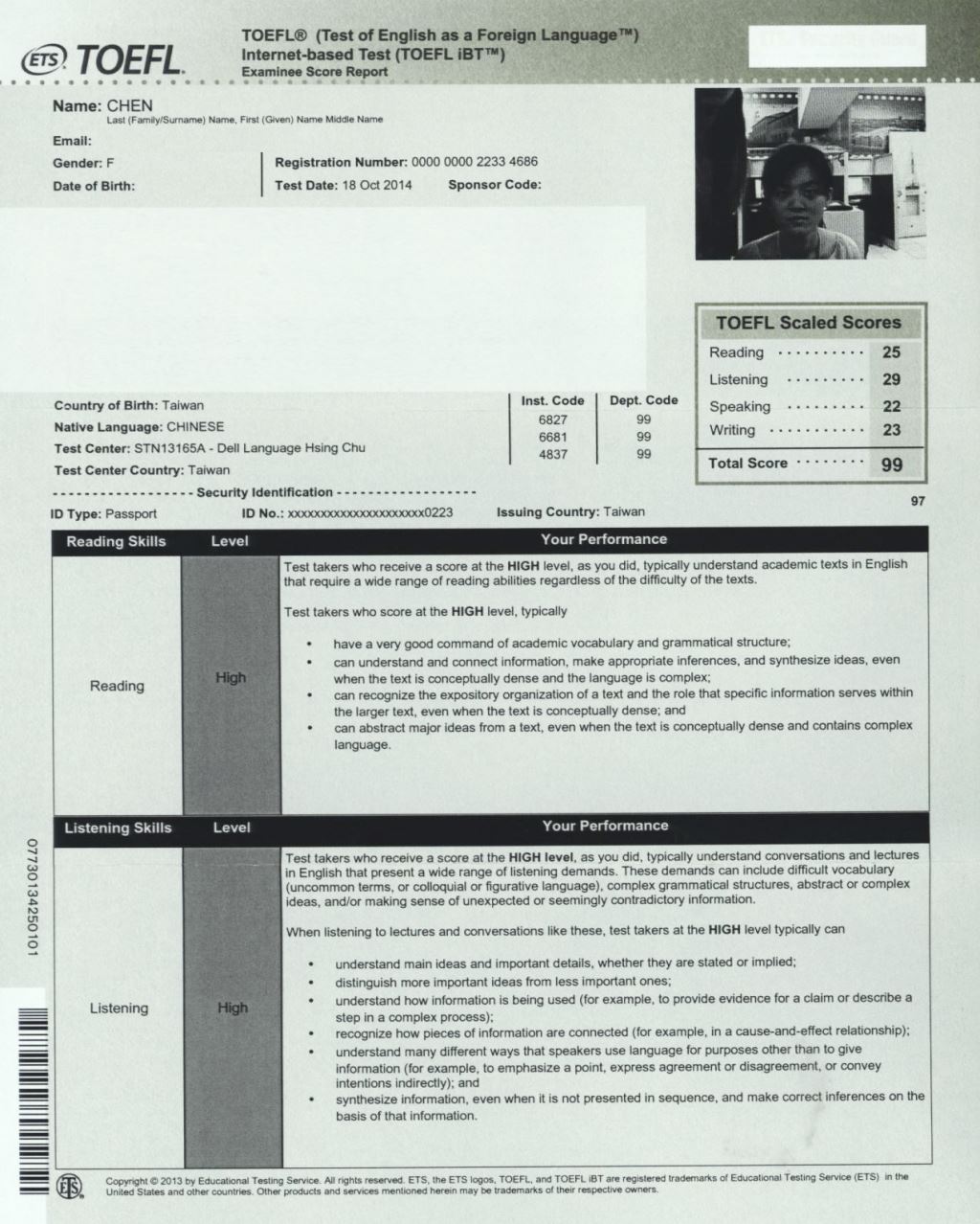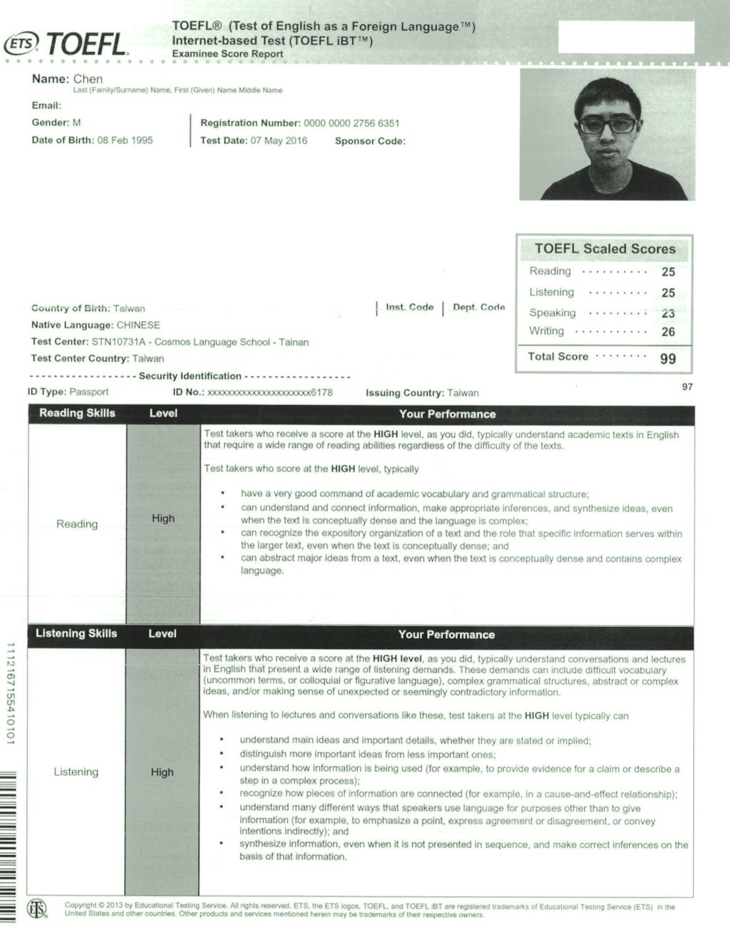 我是目前就讀於國立成功大學工業與資訊管理系的大四學生,因為將來想要去國外繼續進修,所以開始準備托福考試。高中的時候有幸三年都遇到不錯的英文老師,加上我本身是屬於語感不錯的人,所以大學英文對我來說不是太難,大一時就達到學校免修標準以及畢業門檻,但是每次做起托福TPO的題目總是覺得相當卡,長篇的科普閱讀以及涵蓋人文社會科學到生物學各式各樣題材的寫作跟口說命題都讓我吃足苦頭,每次做TPO的成績都慘不忍睹,也因此,一開始我對於一戰的目標沒有很高,只希望可以考到80分以上,參加戴爾差不多半年的課程以後,就報名了4月底的考試場次,沒想到一次就有了99分的佳績。