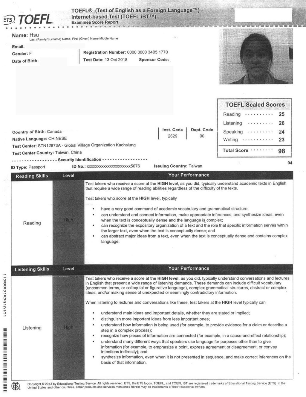 這次的成績雖然距離心目中理想的分數仍有些微的差距,但相較兩年前在毫無準備的情況下的考試分數足足多了20幾分。謝謝戴爾福務顧問細心的解說及戴爾美語每一位老師紮實的課程及總是願意討論學習心得的同學們。感謝戴爾美語,讓托福考試的準備簡單、迅速、確實!!