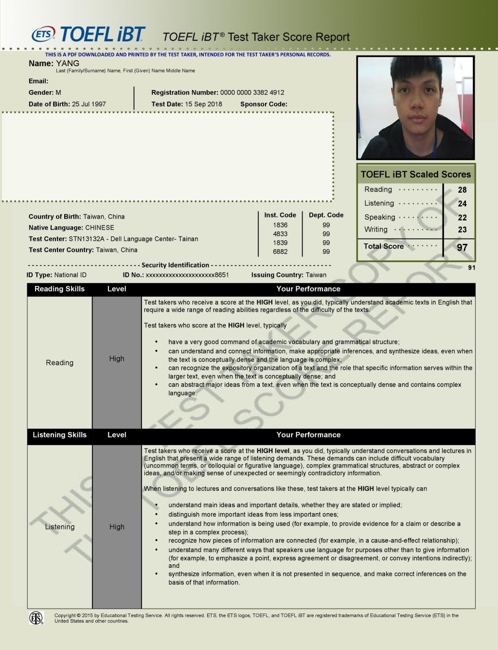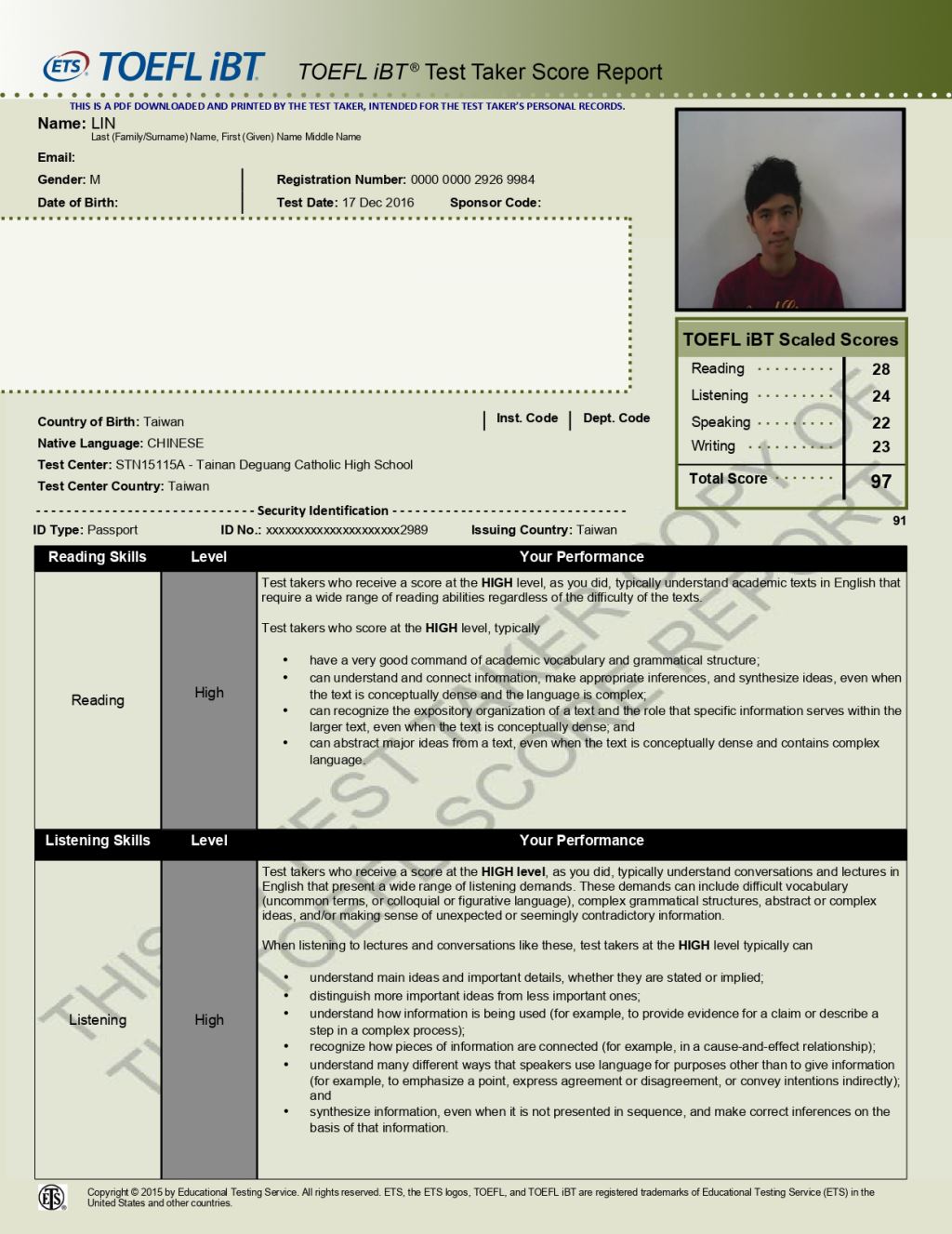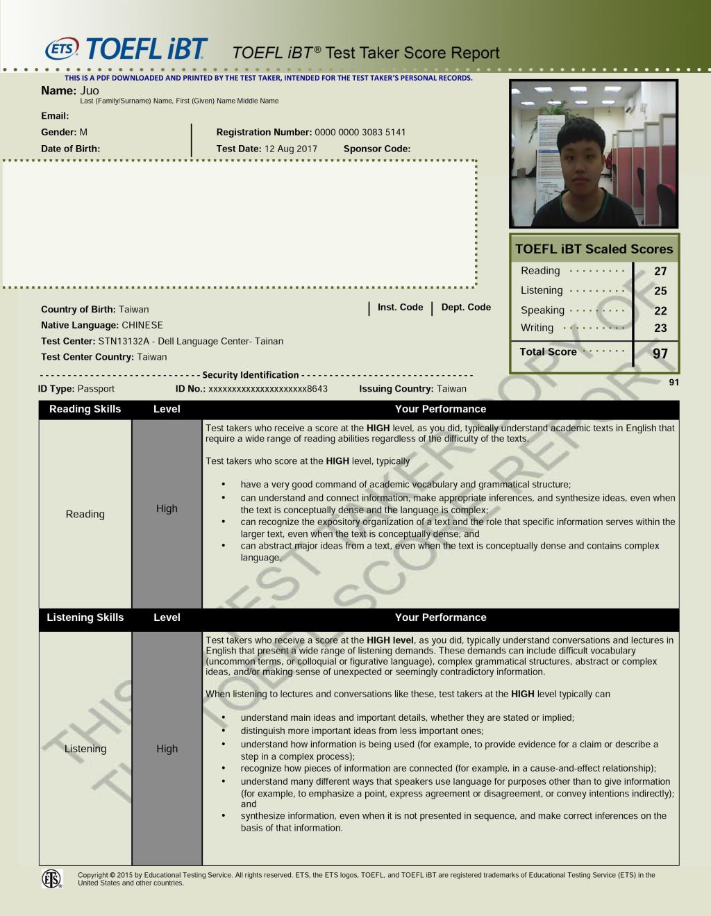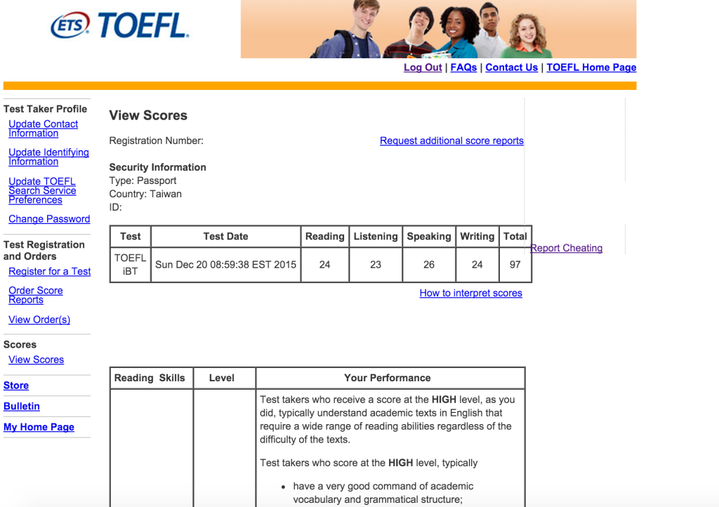 - 2015/12/12參加了位於戴爾美語高雄校考場的托福考試,獲得了聽力24分、閱讀25分、寫作24分、口說24分,總分97分的成績。以下是我各項目準備的心得。