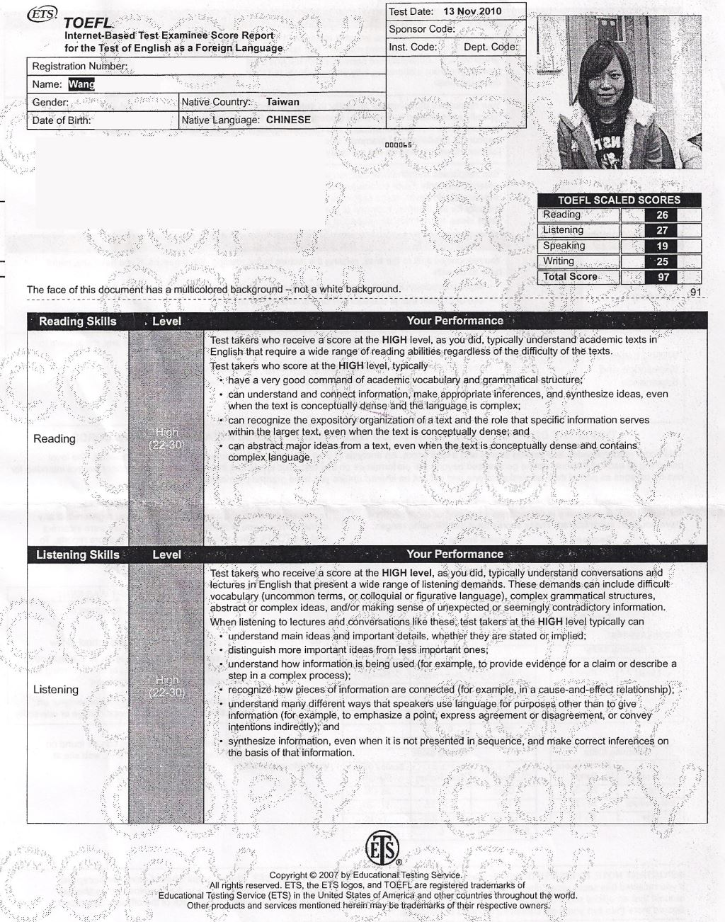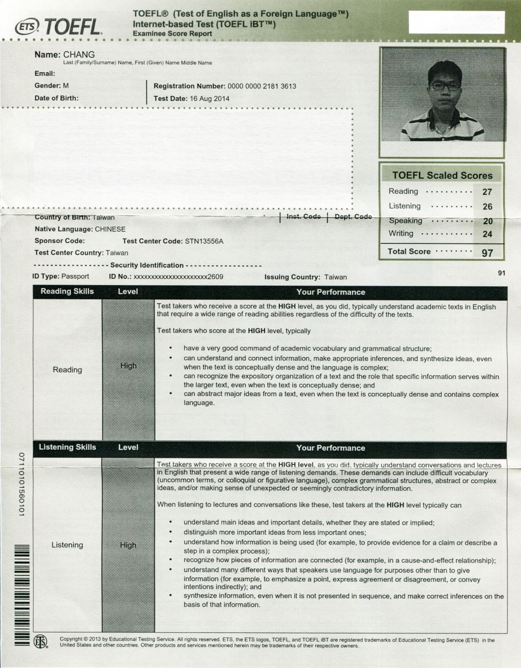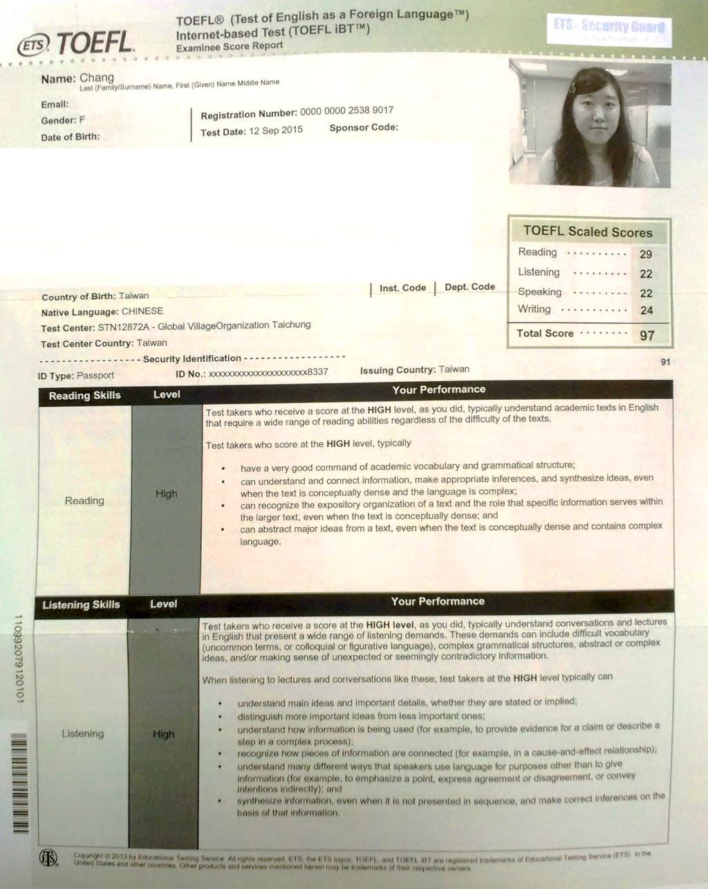 - 2015/12/12參加了位於戴爾美語高雄校考場的托福考試,獲得了聽力24分、閱讀25分、寫作24分、口說24分,總分97分的成績。以下是我各項目準備的心得。