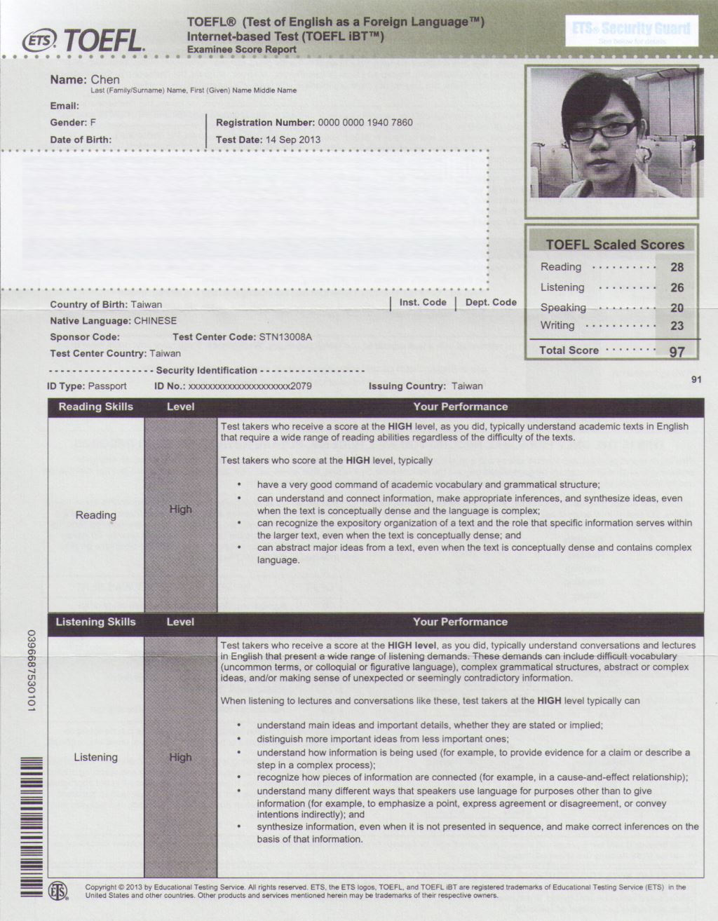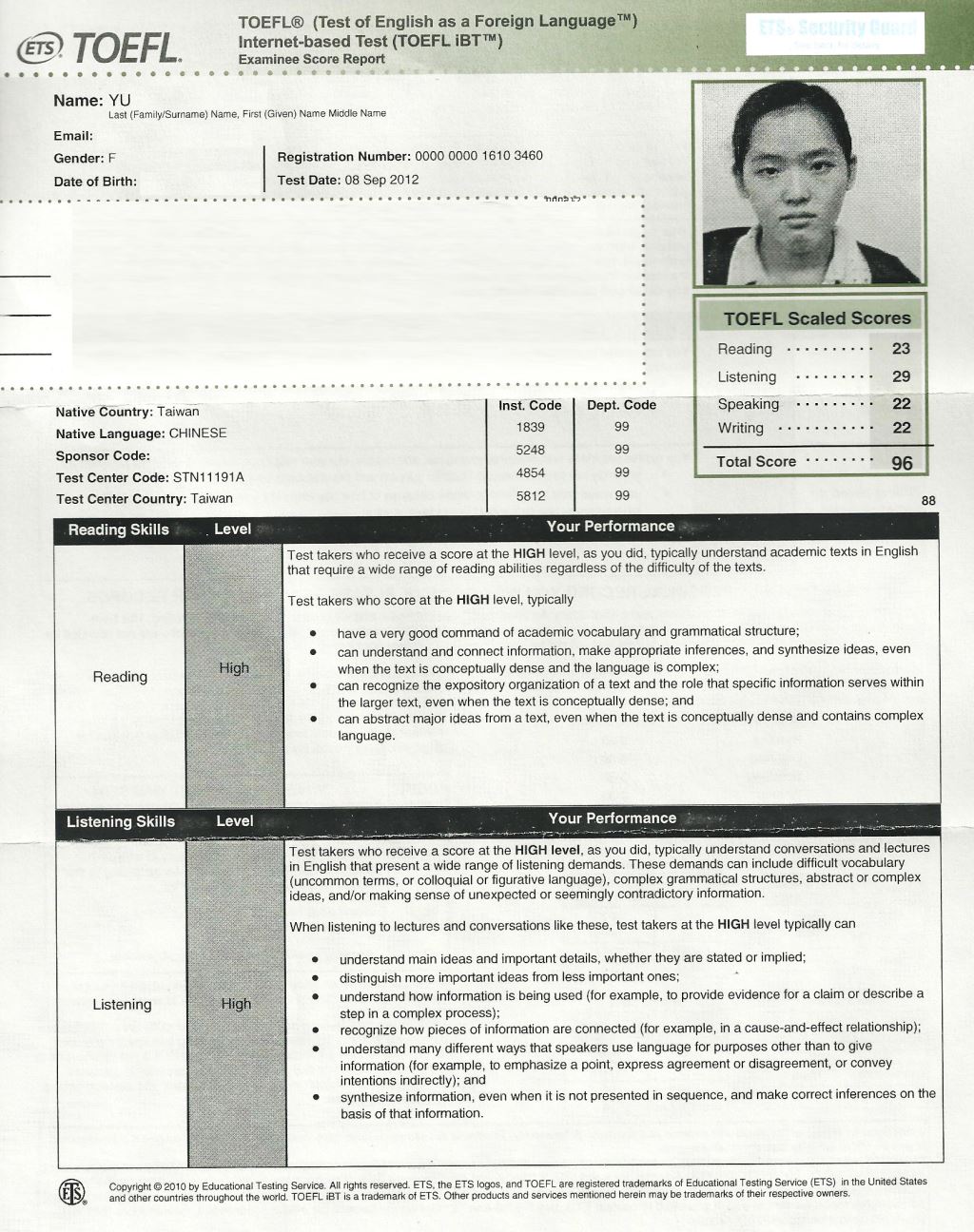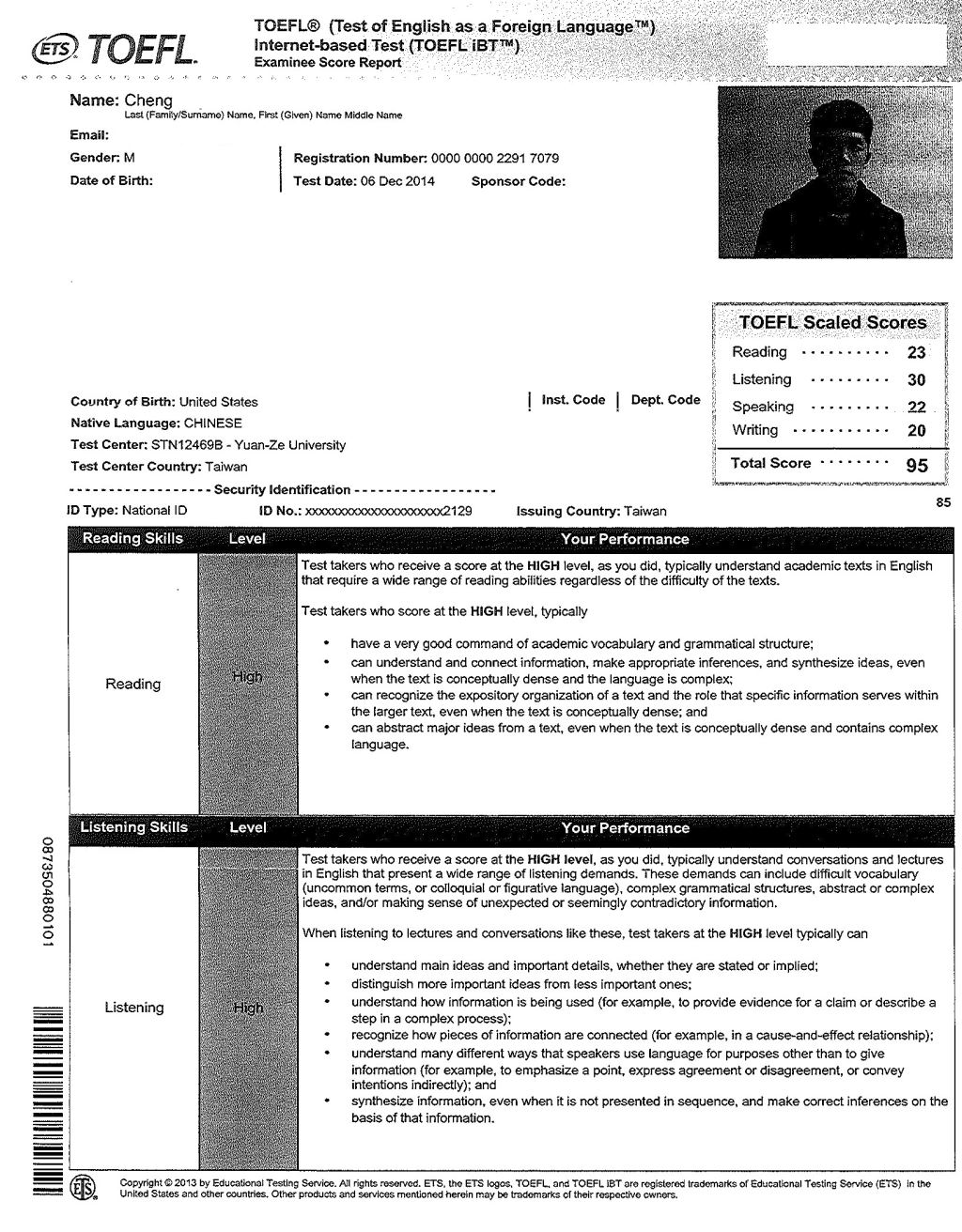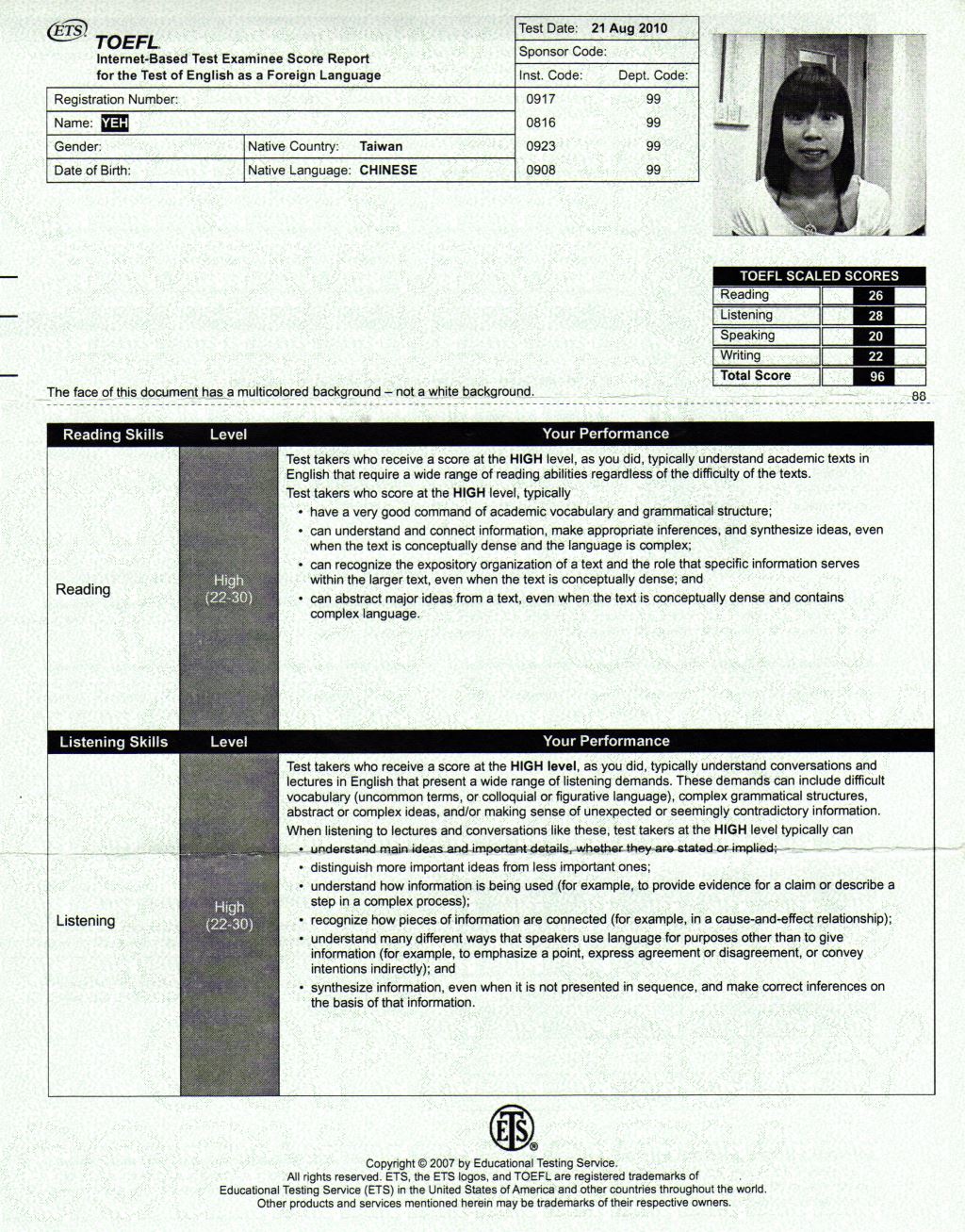 - 簡述:成績出來的時候大大的超過了我的預估,其實我認為托福考試,英文能力雖然重要,但是技巧也是非常不可或缺的。