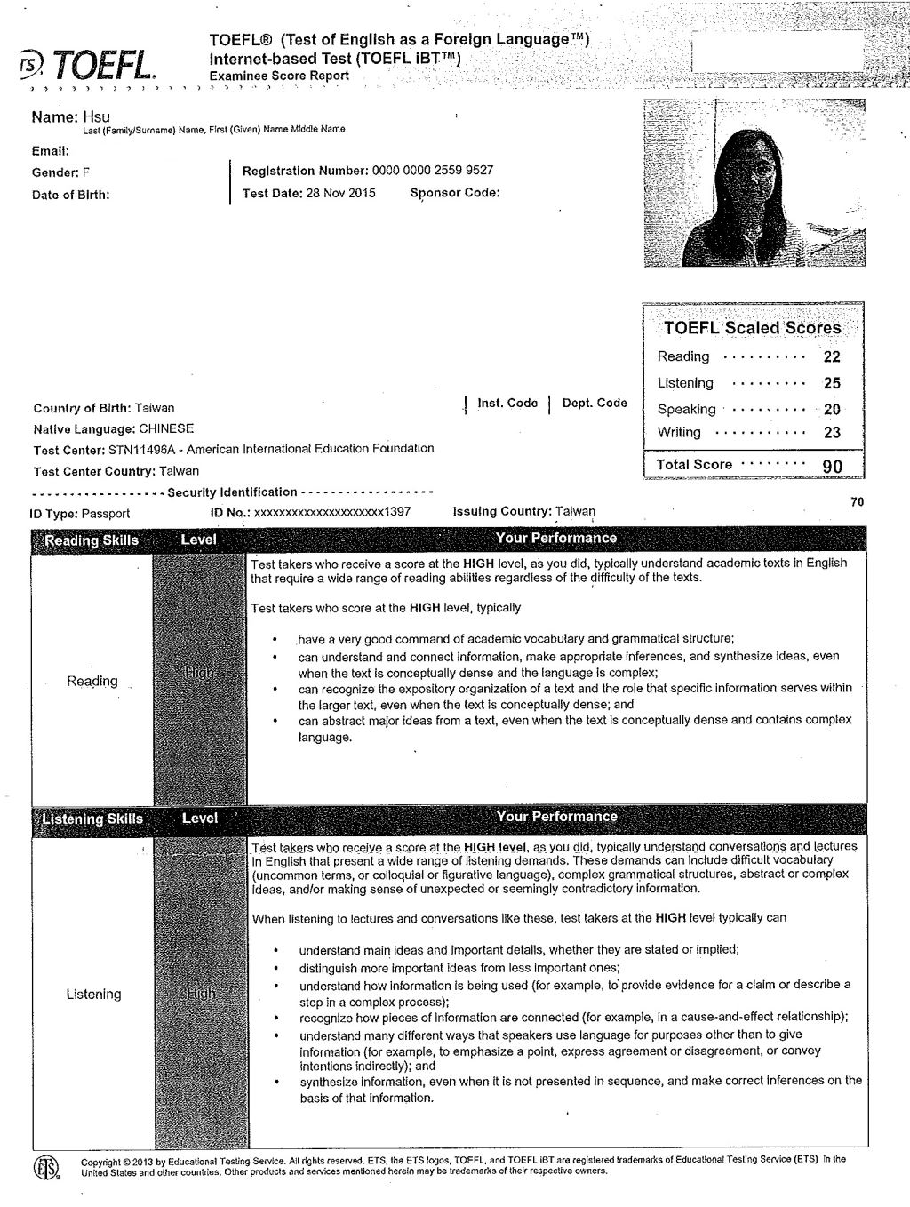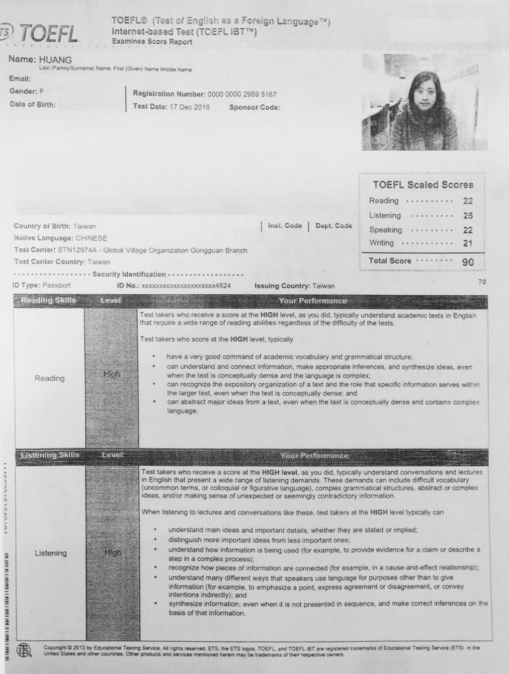 從去年九月開始進入備戰狀態,一直到十二月一站試水溫,考了77覺得差強人意但還可以接受。但在第二戰時,原本預期可以上90,結果查成績那一刻瞬間崩潰才81,聽力竟然還退步一分。二戰是讓我最沮喪的時候,覺得聽說讀寫都比第一戰順,但卻只有閱讀進步,那時有點無力。但還是在成績出來後馬上報了第三戰,結果在5/17時終於上了90,查成績那刻真的鬆了一口氣!