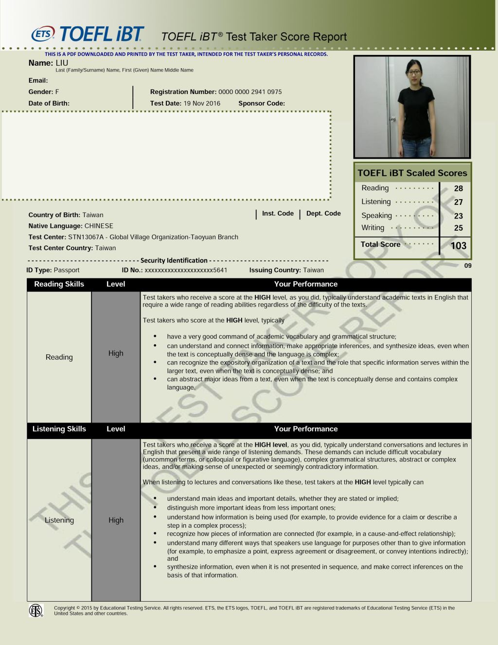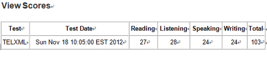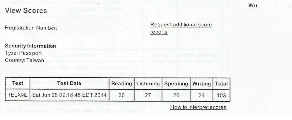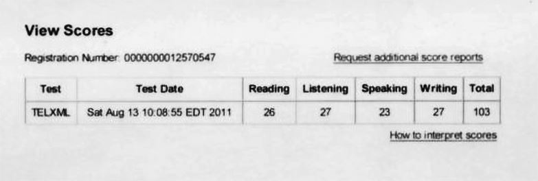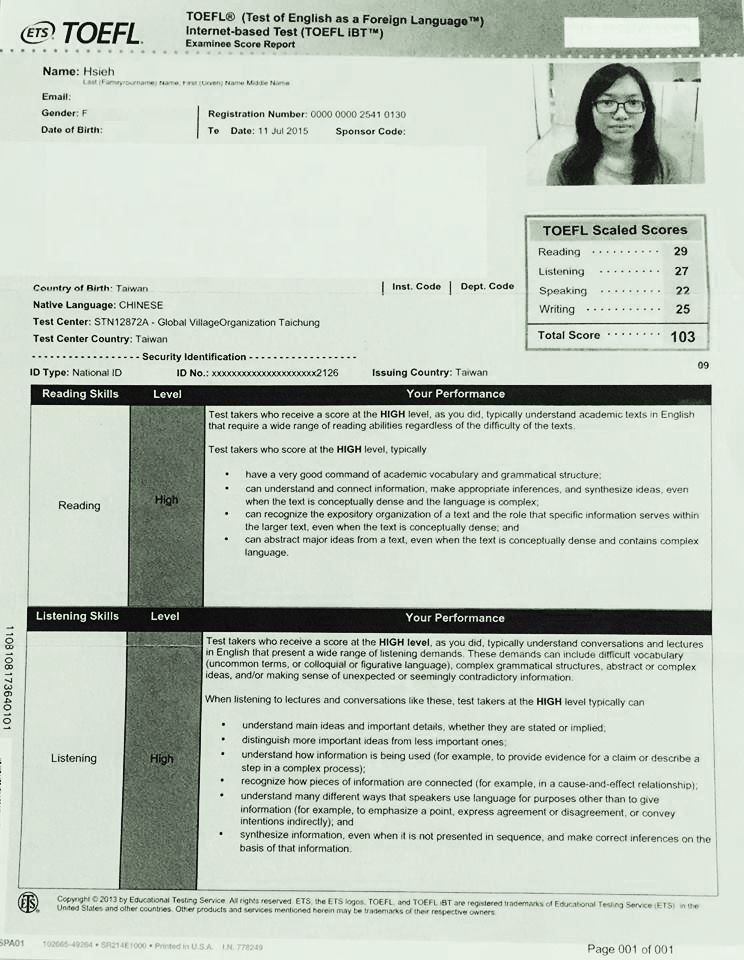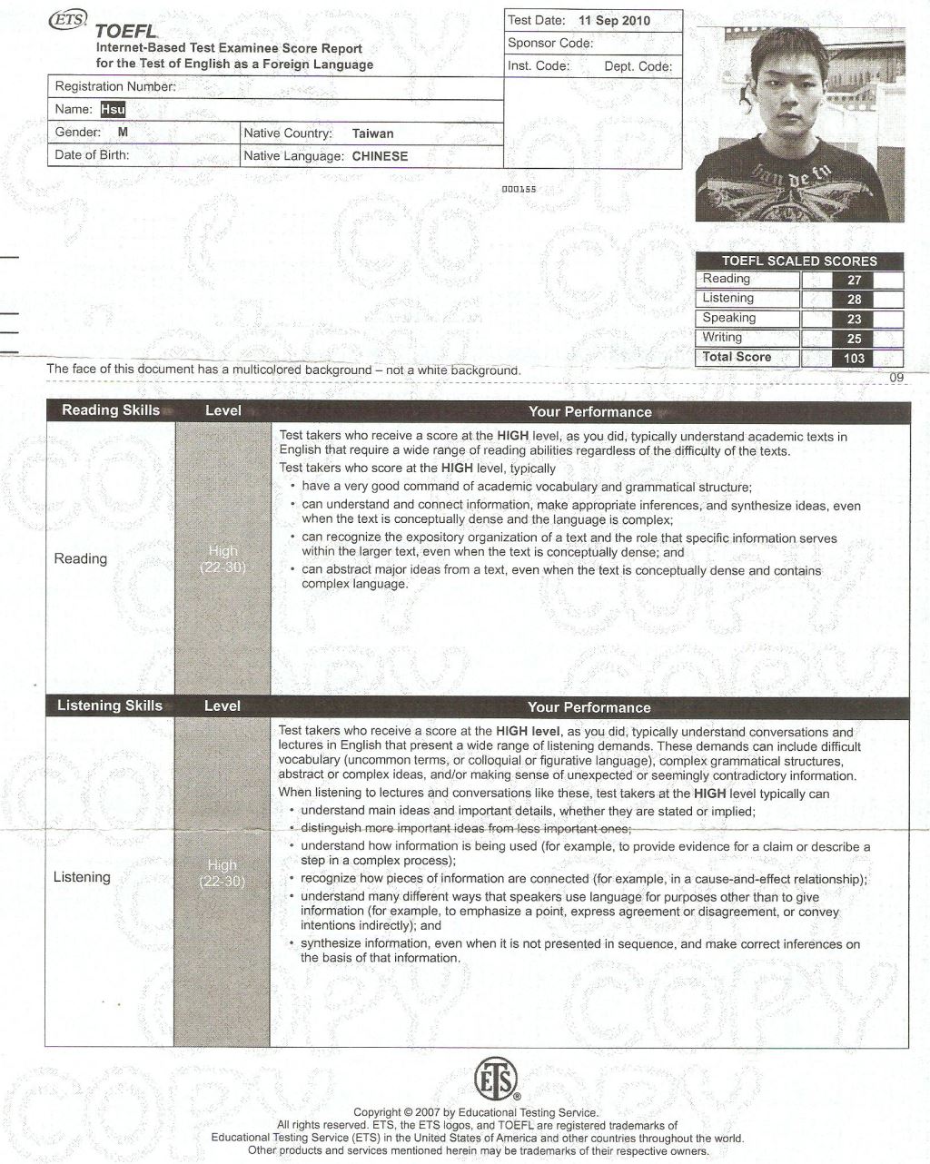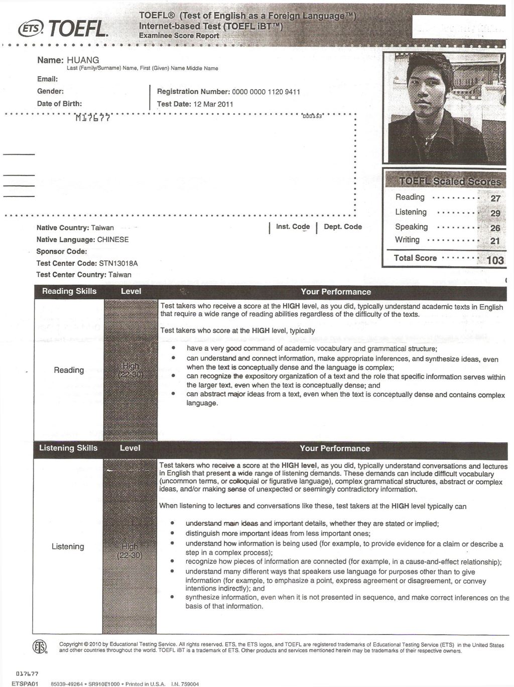 最後第三次考試的時候,我的口說成績進步到23分!其實,只要照著老師的方法做,我就進步6分,『總分到103分』已經達到我要的學校門檻,不用再擔心托福成績了!我認為,托福要考高分其實是要有好的老師帶,再加上自己肯努力讀,托福真的就沒有想像中的難!