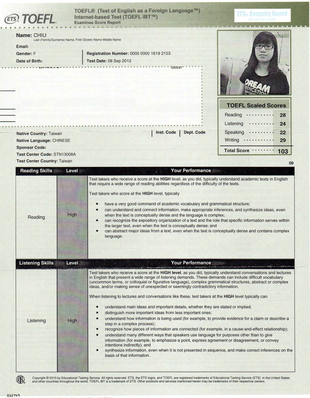 哇~103分欸…連我自己也沒料到,看到成績的那瞬間簡直無法相信,還一直重複登入ETS的帳號好多次,來確定到底是不是真的。回想自己還沒來戴爾美語補習之前,面對托福閱讀那三大篇落落長的文章和有強烈安眠效果的聽力以及幾乎不給時間準備就要開口說一堆的口說 and 最後的寫作大魔王,每一關都超級令人感到冷汗直冒、腳底虛浮、眼冒金星。直到加入了戴爾美語托福課程,一切的困境都被克服了!!!![轉圈撒花]