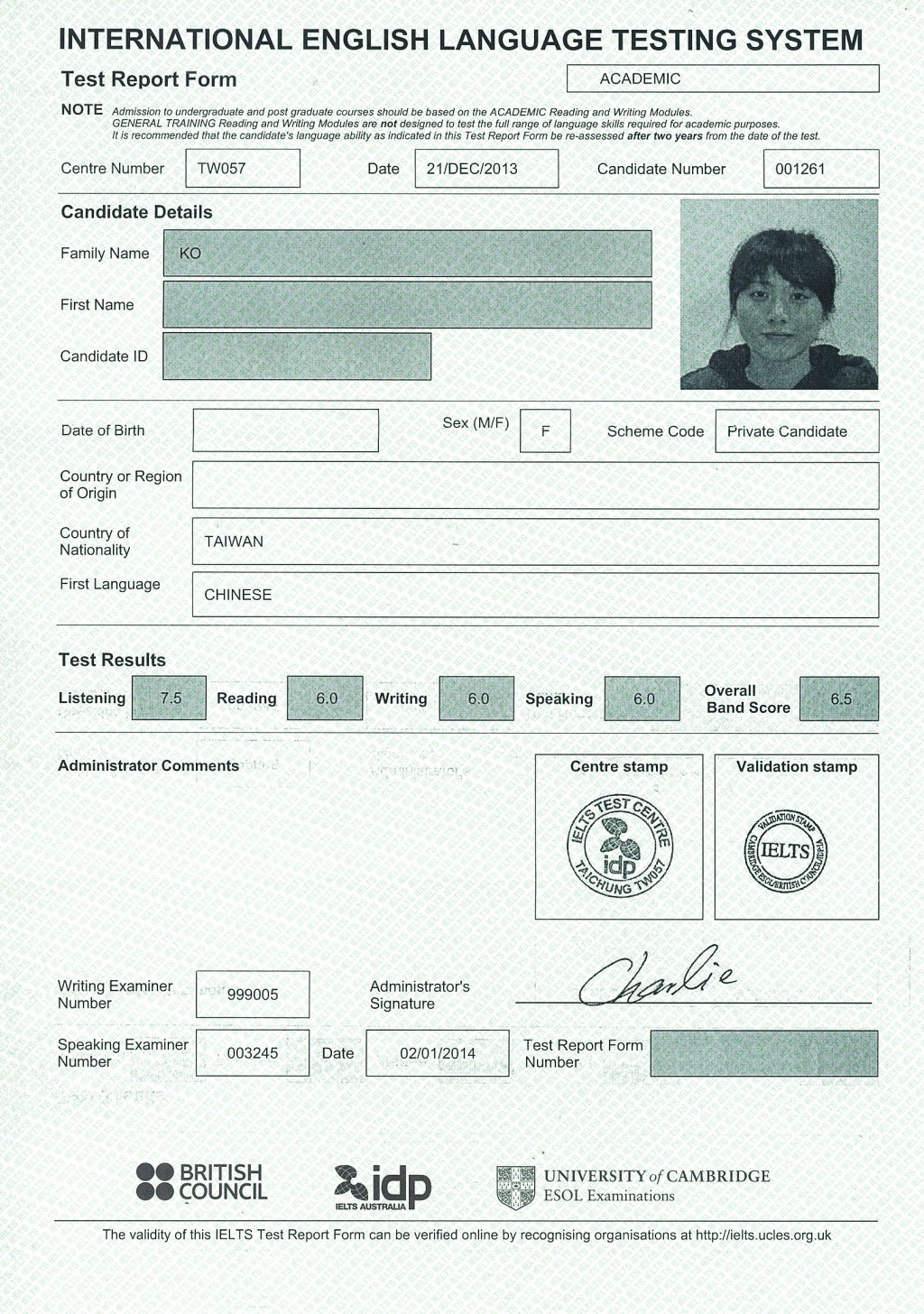 這是準備IELTS (ACADEMIC)是為了畢業後研究所的申請,學校普遍要求只有6分,因此考到6.5分覺得很感激。我要感謝主耶穌讓我在戴爾快樂地學習英文,還要感謝所有傾囊相授的老師,也要感謝辛苦的櫃台專員,特別是漂亮的SANDY,總是不辭勞苦為我解決所有問題,疼我像妹妹,讓我覺得戴爾美語就像一個家!謝謝所有同學的鼓勵與互相照顧,希望大家都能夠得到夢想中的分數,共勉之。