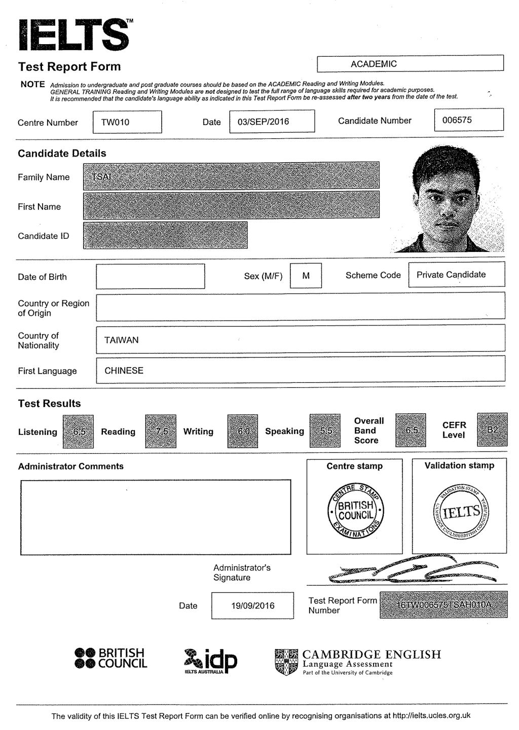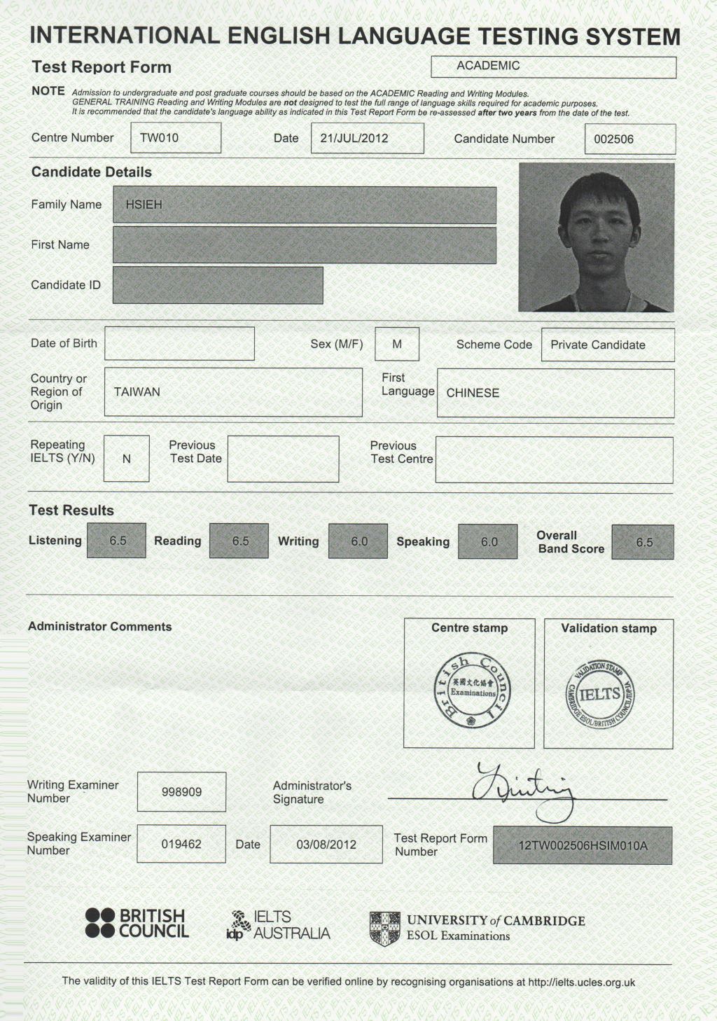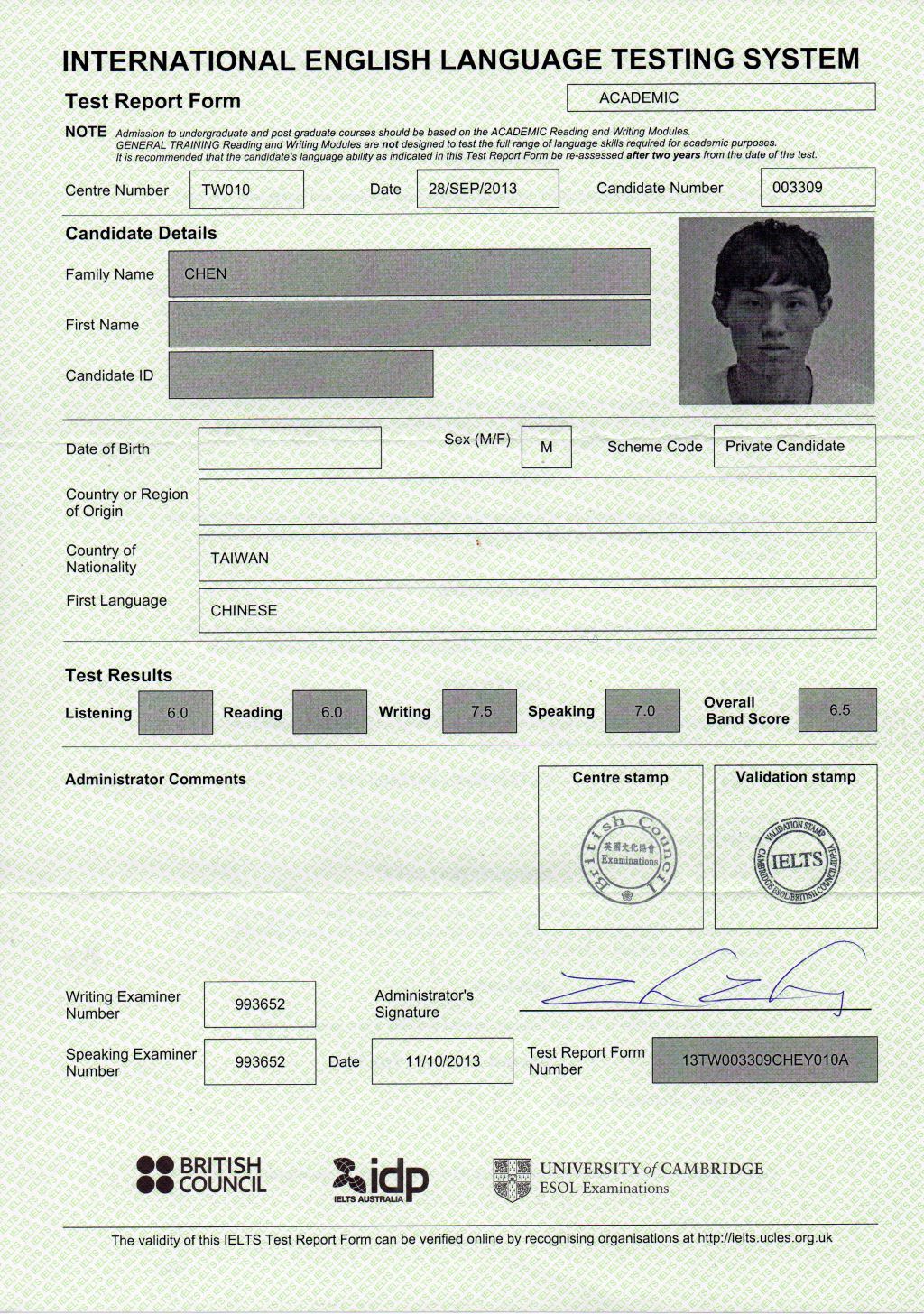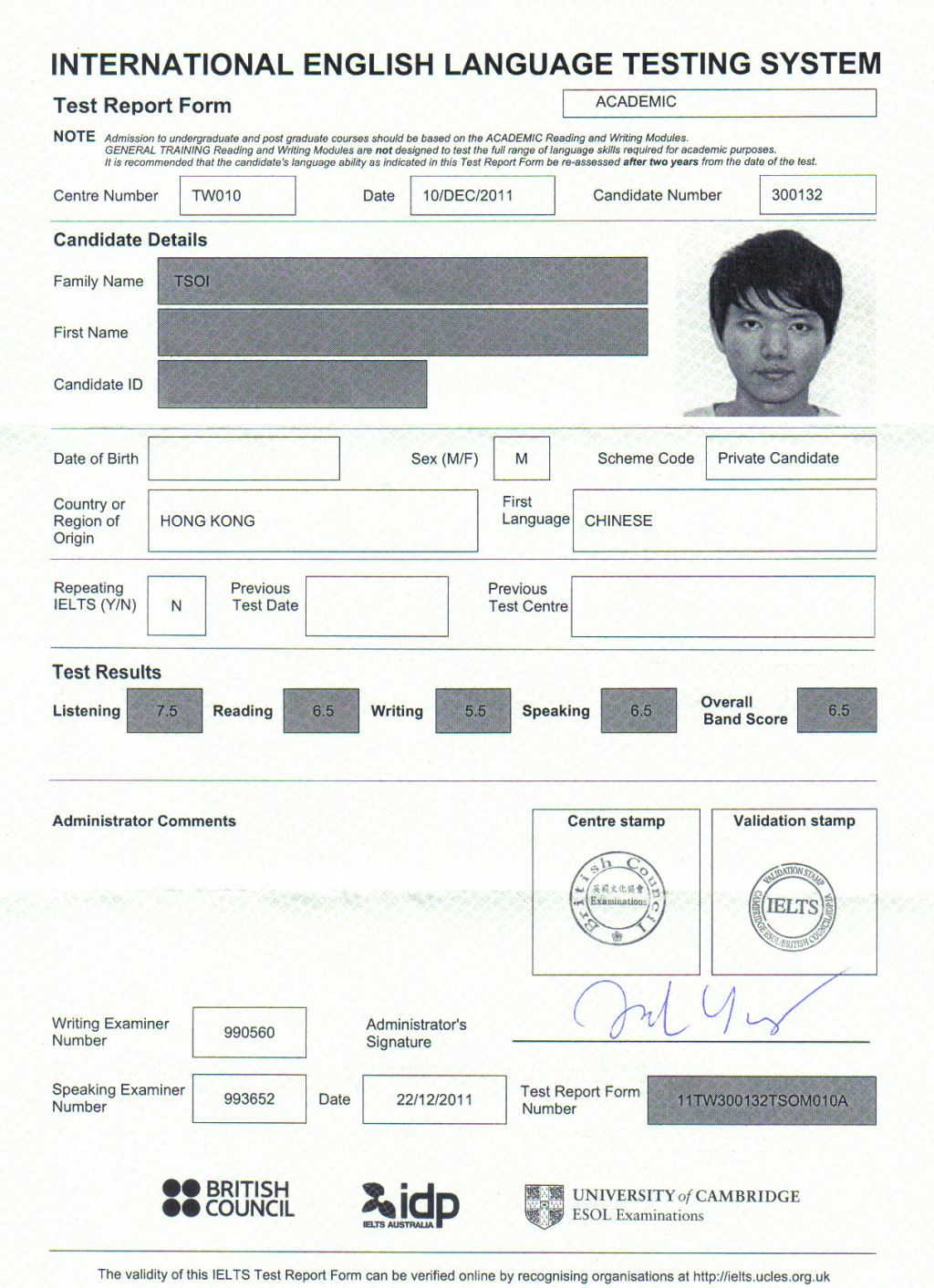 - 簡述:HOLLE我是東海大學的學生蔡文丰,今年是大四。我在2011年的12月10參加IELTS考試,成績算還好overall 6.5,四個部分分別是listening 7.5、writing 5.5、reading 6.5 、oral 6.5。以下我想跟大家分享我每個部分是如何準備的。
