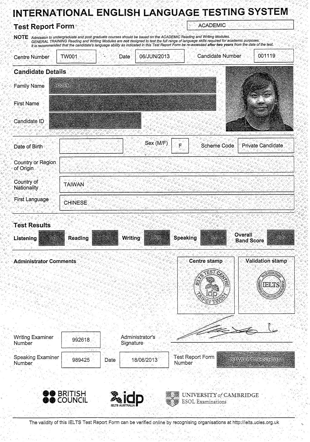 HOLLE我是東海大學的學生蔡文丰,今年是大四。我在2011年的12月10參加IELTS考試,成績算還好overall 6.5,四個部分分別是listening 7.5、writing 5.5、reading 6.5 、oral 6.5。以下我想跟大家分享我每個部分是如何準備的。