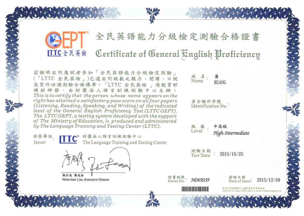 興奮地接下全民英檢中高級通過的證書,令我難以置信的是自己竟然可以在一年裡有那麼顯著的進步,從全民英檢中級一躍至中高級,看似不可能的任務,這全都要感謝戴爾美語的幫忙!