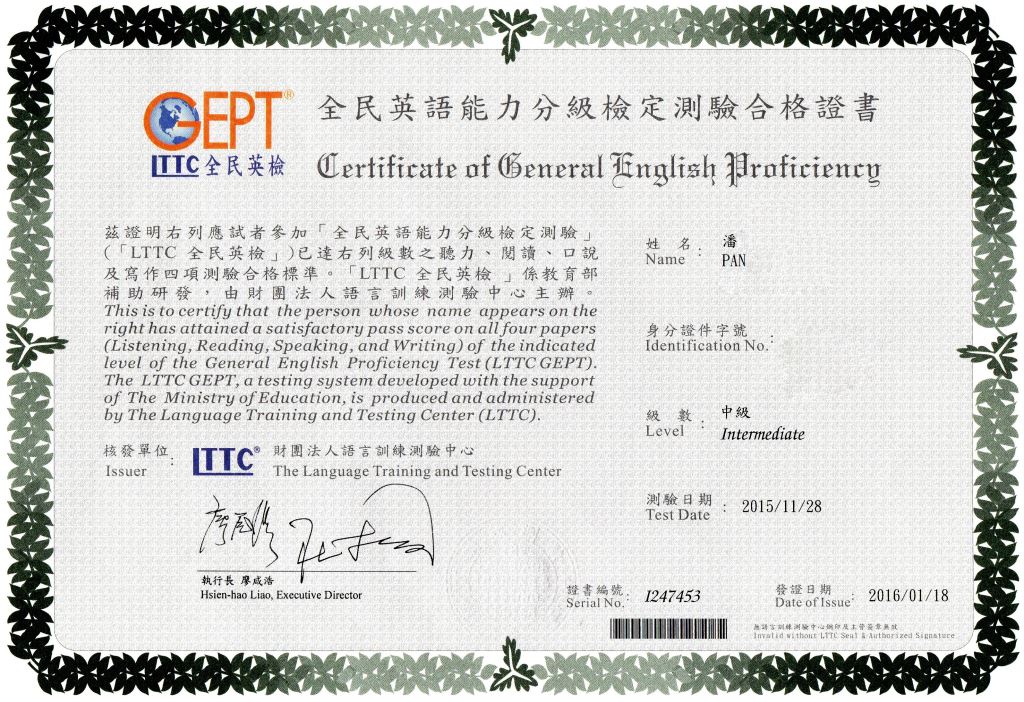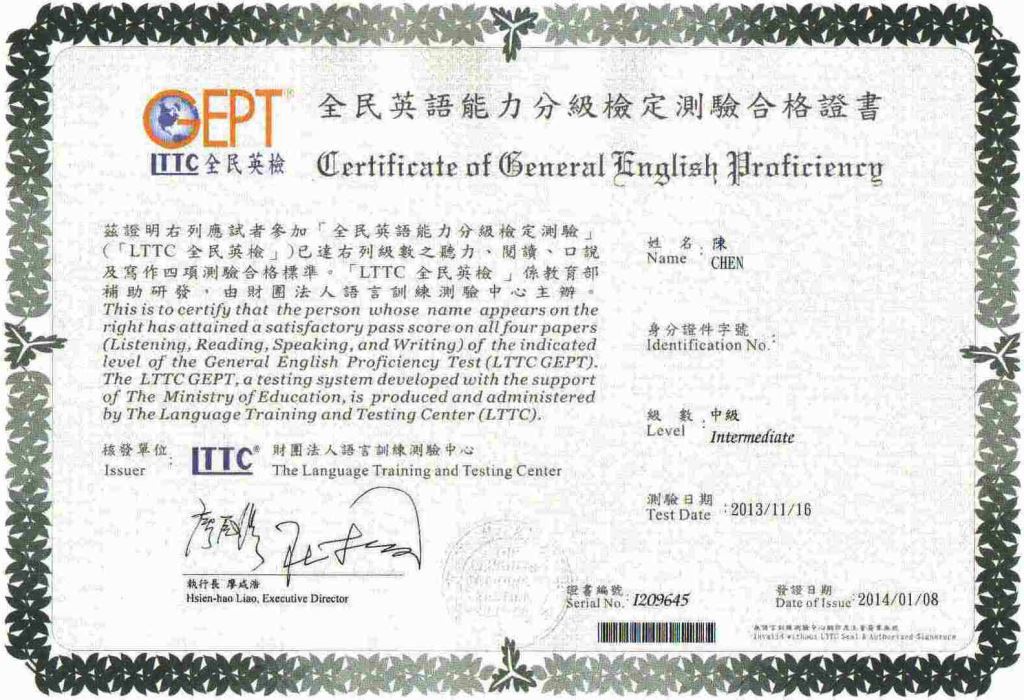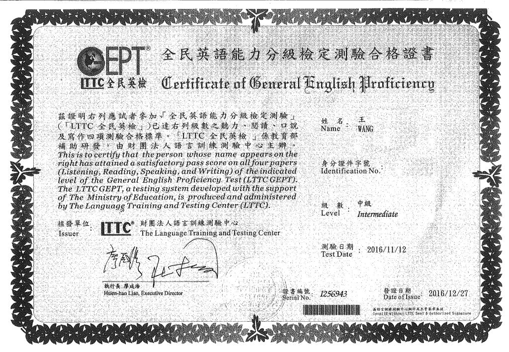 在百般的努力與奮鬥下,今天我終於通過了中級英檢,過去在國中的時候,由於就讀的是資優班,因此幾乎一半的同學就都已經通過了中級英檢,這讓我非常的著急,深怕自己比不上別人,因此下定決心要在高中畢業前通過它,好給自己一個交代,從來沒有英檢考試經驗的我,跳過初級直接挑戰中級,竟然一次就全數通過,令我非常的意外與感動。