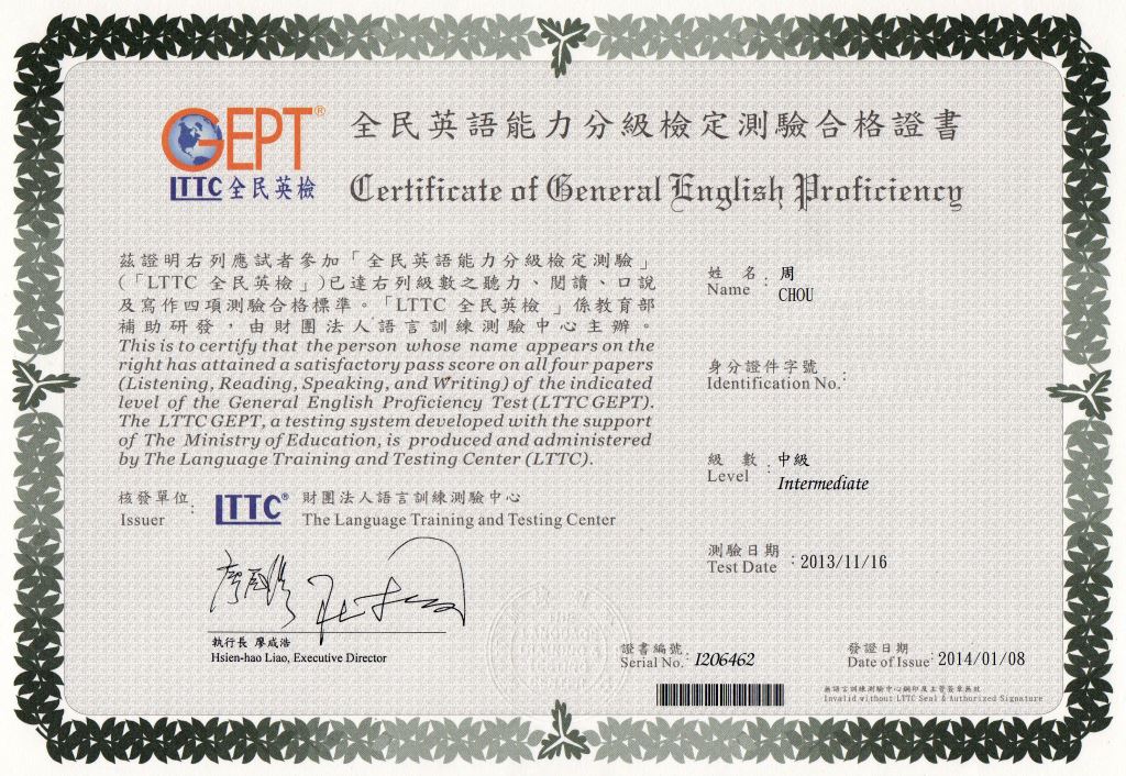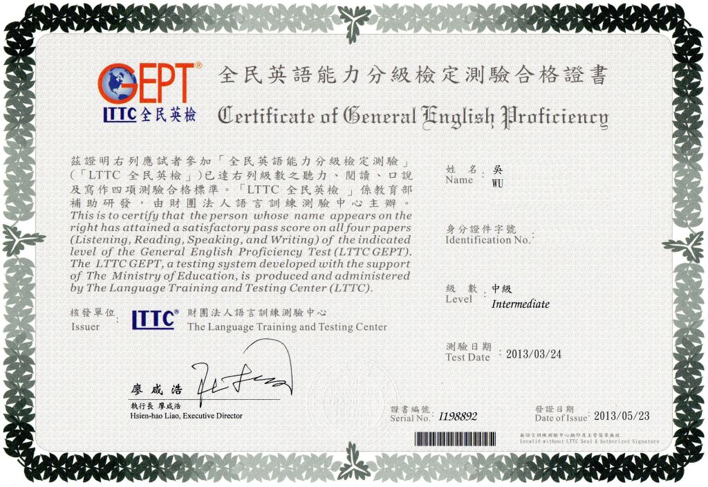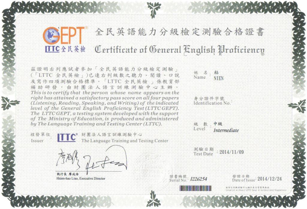 - 簡述:自從選擇戴爾美語之後不僅增加讀書的效率也使我在準備考試的過程中多很多具體的方向。非常感謝戴爾美語提供良好的英語學習環境讓我有這個機會能通過全民英檢中級以及分享心得。
