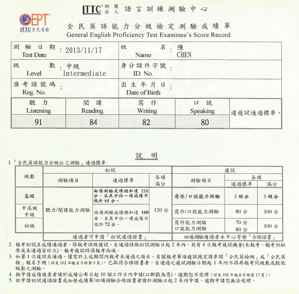 然而,在各位老師的教導之下(Peter、Willie、Simon老師),我已經在100年3月27日通過了中級英檢複試,而且這一次,我的口試部分進步很多,拿了90分,真的非常感謝戴爾教導過我的各位老師。