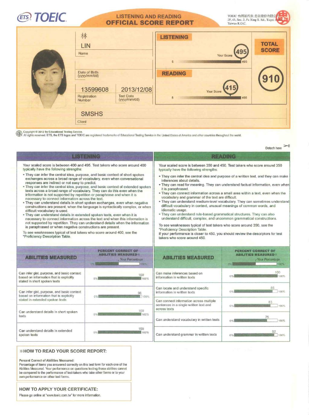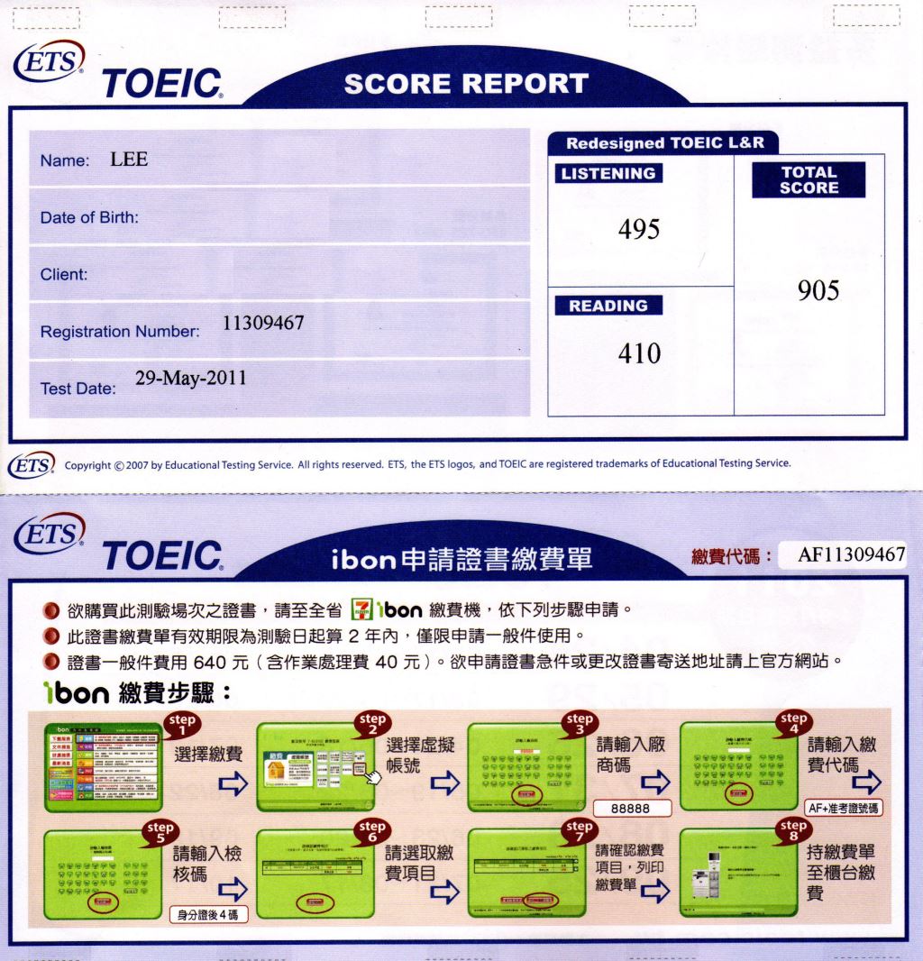 • 簡述:我是戴爾美語托福班的學生,在準備托福考試之餘,也想考取多益證書。這次在12月的中學生校園場多益得到910分,分別是聽力495分和閱讀415分。