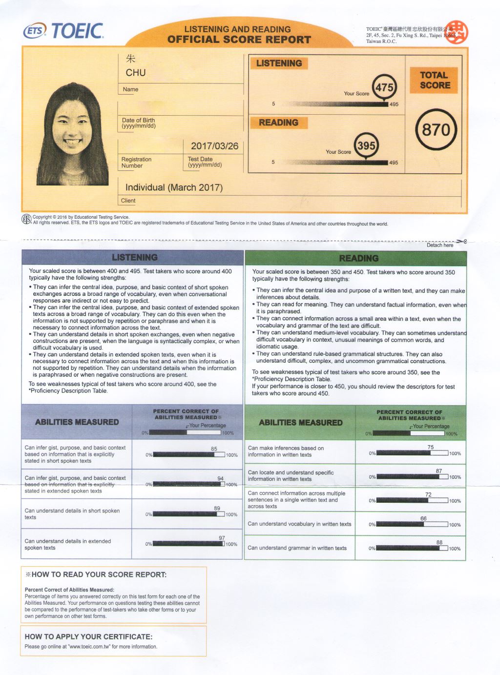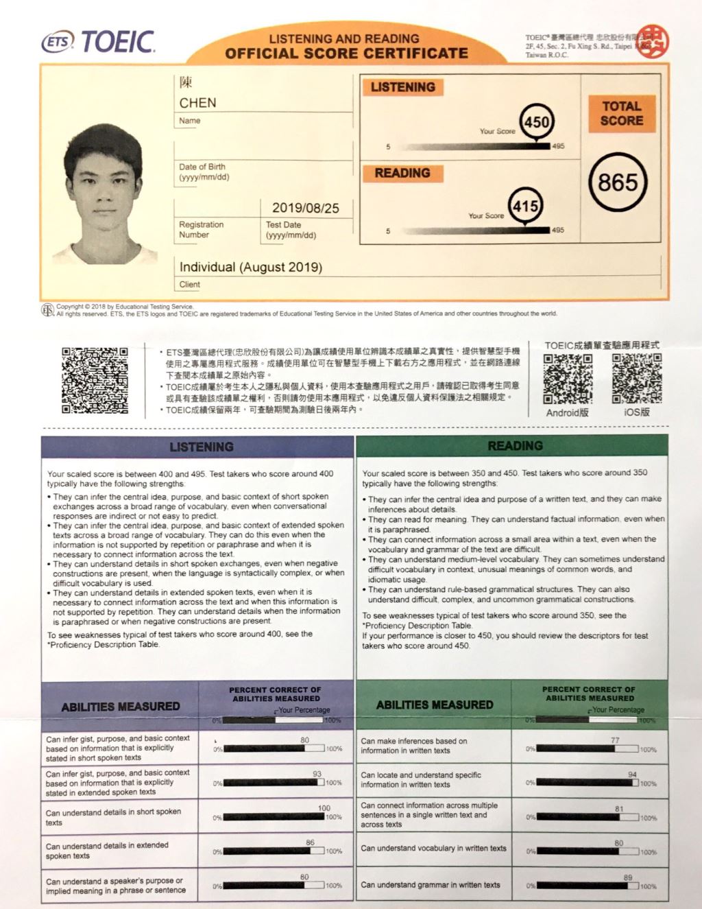 • 簡述:我是第一次報考多益的學生,能夠拿下金色證書,也就是超過860的高分,我相信如果沒有戴爾美語的老師的指導,我是無法達到這種分數的。