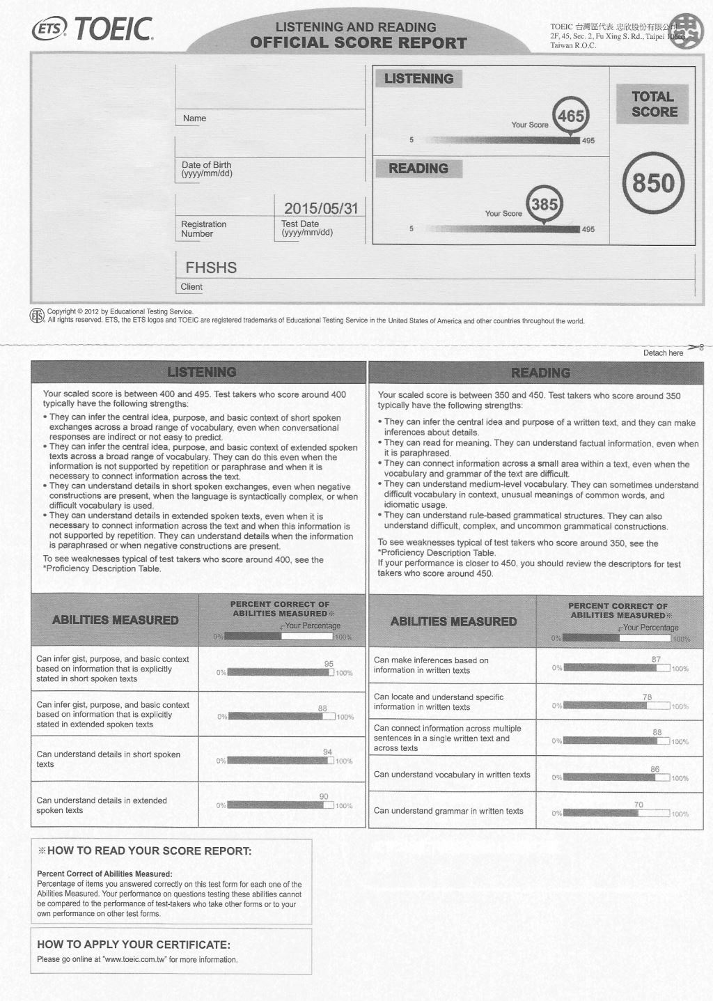 我記得最後一次的模擬考,我考了非常接近八百的分數,這是考試前一天,我把單字看一看就睡了,除了隔天保持良好的心情去考試,也要注意身體狀況,前一天我發現有點腹瀉,就立刻去買止瀉藥,避免影響考試;考完後我自己覺得還可以,跟平常的練習感覺差不多,聽力有簡單一點,但閱讀測驗還是跟往常一樣有點寫不完,整體來說都還好,所以我就安心地等成績。最後成績出來我考了845分,其中聽力滿分閱讀350比想像中好很多,卻很可惜的差15分就有金色證書了!